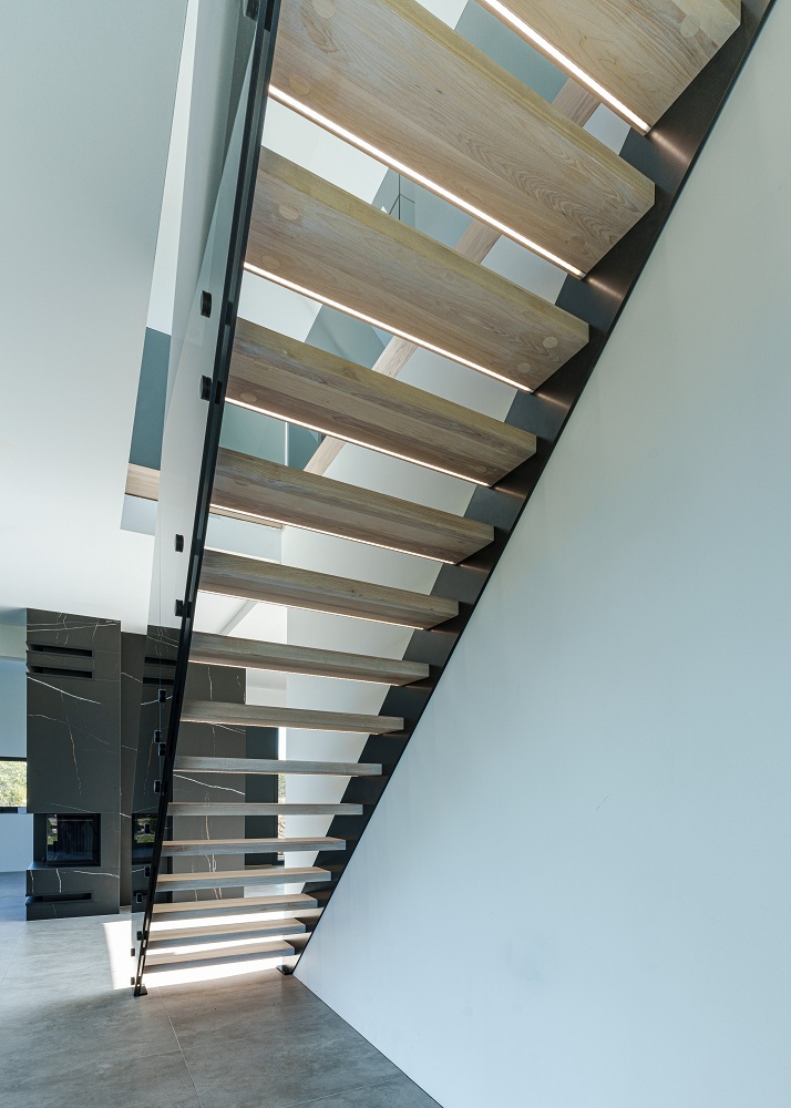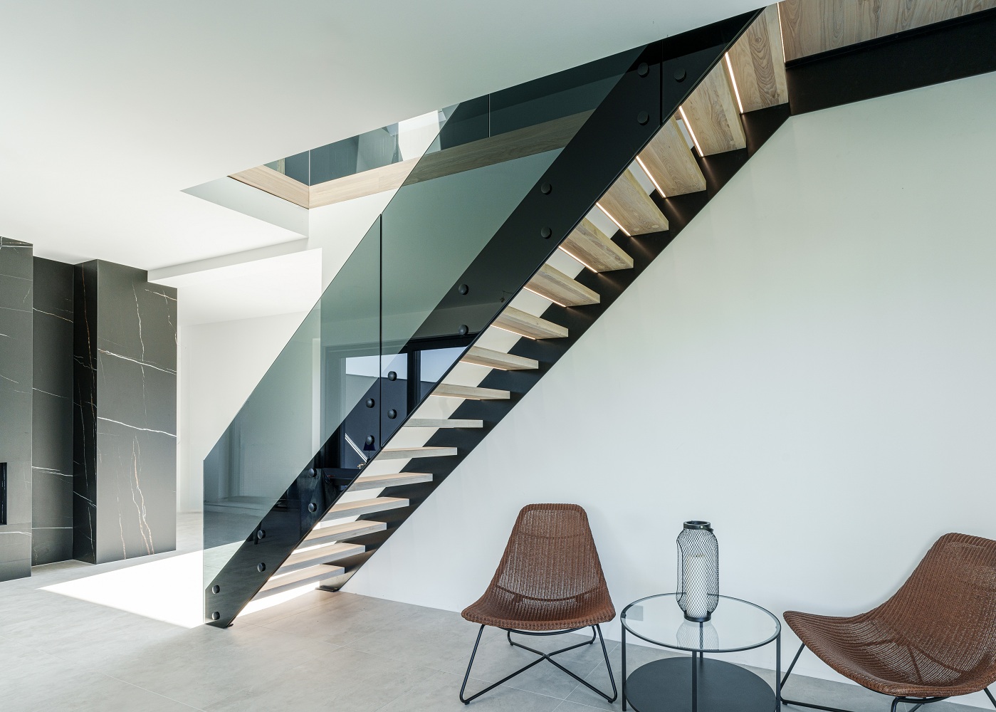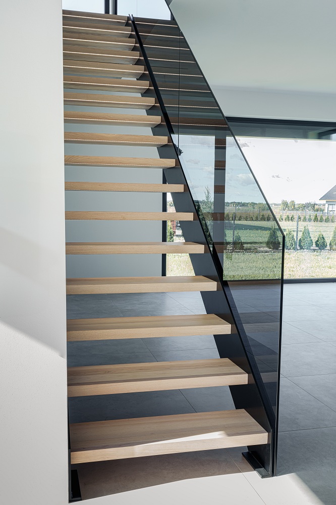 Stahlwangentreppe mit Glasgeländer und Holzstufen.